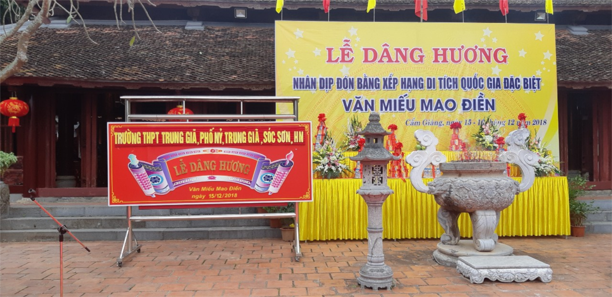 Thực hiện kế hoạch thăm quan giáo dục truyền thống cho học sinh hằng năm, ngày 15 tháng 12 năm 2018 BGH nhà trường đã tổ chức cho học sinh toàn trường đến thăm 2 địa danh. Một là Văn Miếu - Mao Điền thuộc làng Mao (nay là làng Mậu Tài), xã Cẩm Điền, huyện Cẩm Giàng, tỉnh Hải Dương. Tại miền Bắc Việt Nam, Văn miếu Mao Điền có quy mô và lịch sử lâu đời đứng thứ 2, chỉ sau Văn miếu Quốc Tử Giám. Văn miếu Mao Điền được lập ra để thờ Khổng Tử và các bậc đại nho theo truyền thống của Việt Nam gồm: Lần lượt hai bên là Nguyễn Trãi, Chu Văn An, Mạc Đĩnh Chi, Nguyễn Bỉnh Khiêm, Phạm Sư Mạnh, Vũ Hữu, Tuệ Tĩnh, Nguyễn Thị Duệ. Trong đó, Khổng Tử là ông tổ đạo nên được thờ ở chính giữa, bên trái là Chu Văn An, một người thầy mẫu mực trong truyền thống đạo Nho nước ta. Những người còn lại đều là những người con xuất chúng của trấn Hải Dương. Đặc biệt là trạng nguyên Nguyễn Thị Duệ, nữ trạng nguyên duy nhất của nước Việt. Thăm địa danh này giúp học sinh được mở mang hiểu biết về các bậc nho sĩ của đất nước, bồi đắp truyền thống hiếu học, tôn sư trọng đạo, tình yêu quê hương, lý tưởng tiếp bước truyền thống tốt đẹp của các bậc tiền nhân.